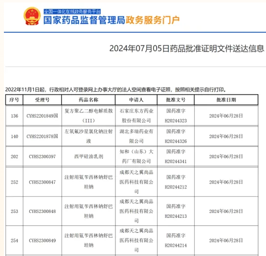 2024年7月(yuè)5日國家藥品監督管理(lǐ)局發布藥品批準證明(míng)文(wén)件(jiàn)送達信息,知和(hé)醫藥通過專業(yè)、高(gāo)效的(de)服務,一日連下四城,捷報頻傳: