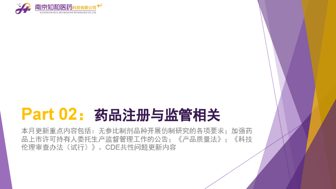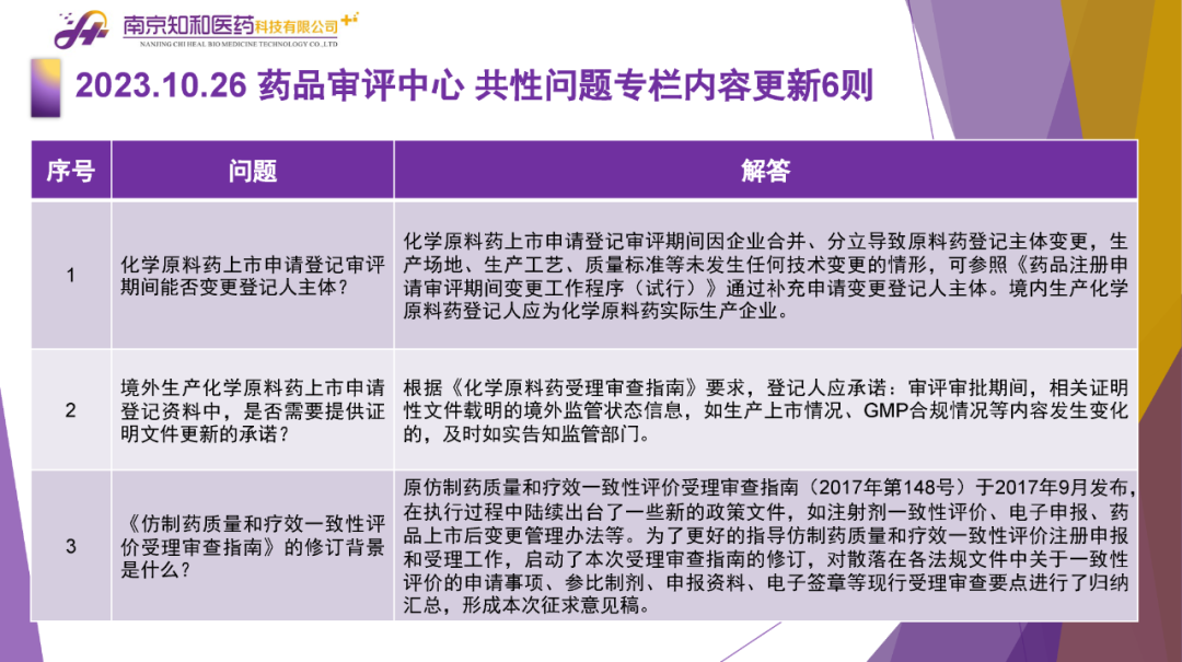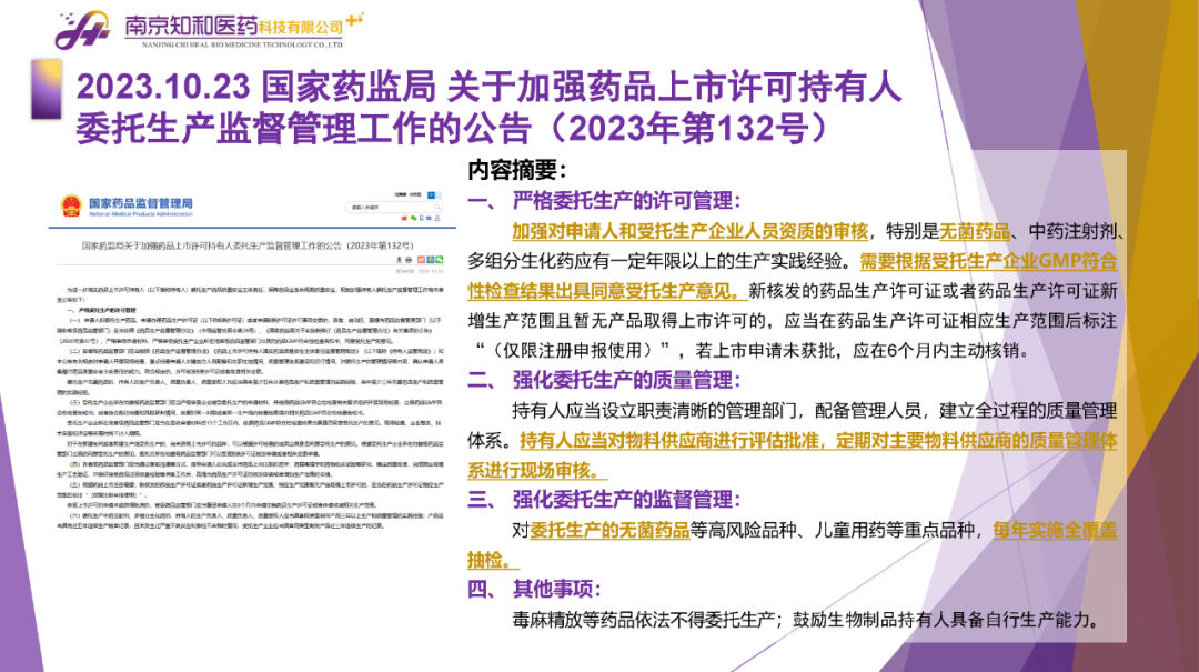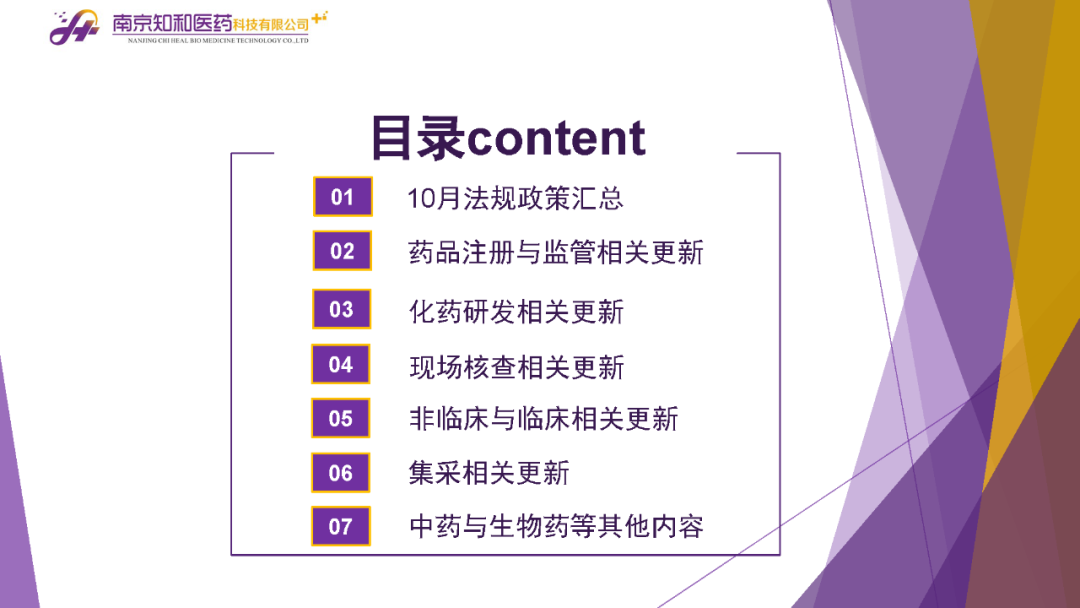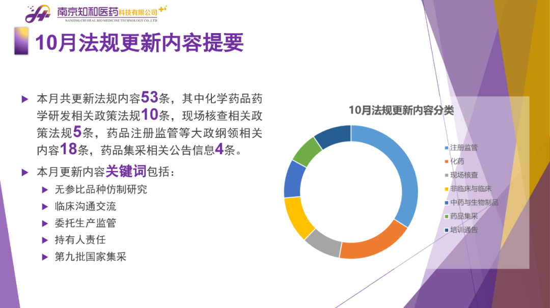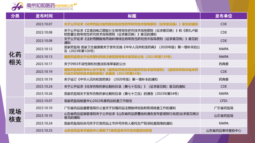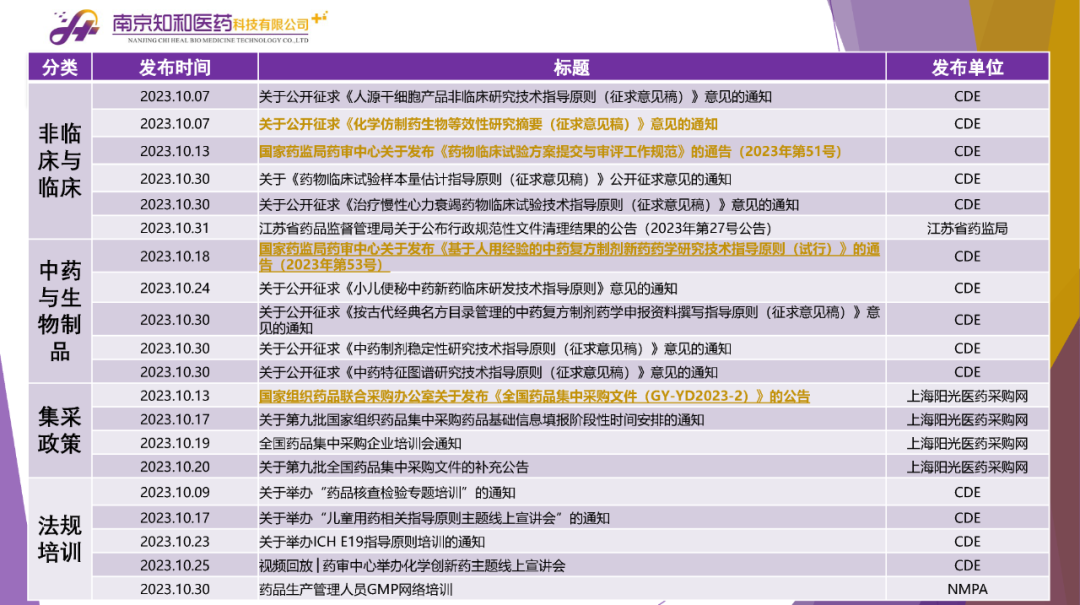 2023年11月(yuè)6日,知和(hé)醫藥注冊部帶來專題培訓《10月(yuè)法規政策梳理(lǐ)與解讀(dú)》,從注冊監管、化藥相(xiàng)關、現場(chǎng)核查、臨床與非臨床、中藥與生物(wù)制(zhì)品、集采政策、法規培訓等七大(dà)模塊對CDE、NMPA、CFDI、藥典委、國家市場(chǎng)監督管理(lǐ)局、藥物(wù)政策與基本藥物(wù)制(zhì)度司、藥監局(江蘇省、山東省、廣東省)、藥品審評查驗中心(山東省)等權威單位2023年10月(yuè)發布的(de)53條法規政策及通知做深入梳理(lǐ)與解讀(dú),開(kāi)展專題培訓。本月(yuè)更新内容關鍵詞包括了無參比品種仿制(zhì)研究、臨床溝通交流、委托生産監管、持有(yǒu)人(rén)責任、第九批國家集采等。