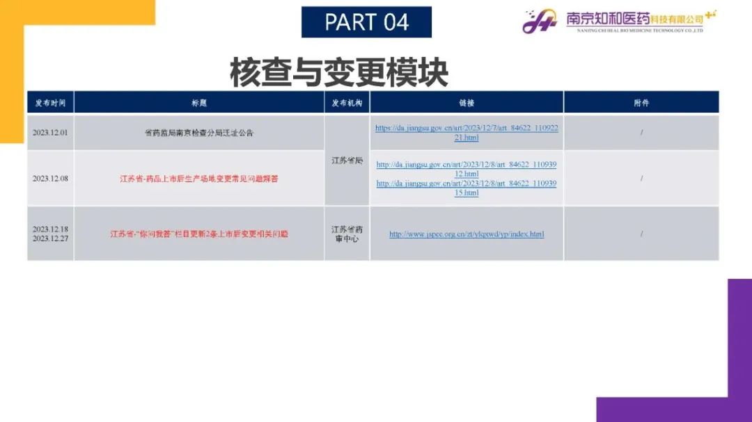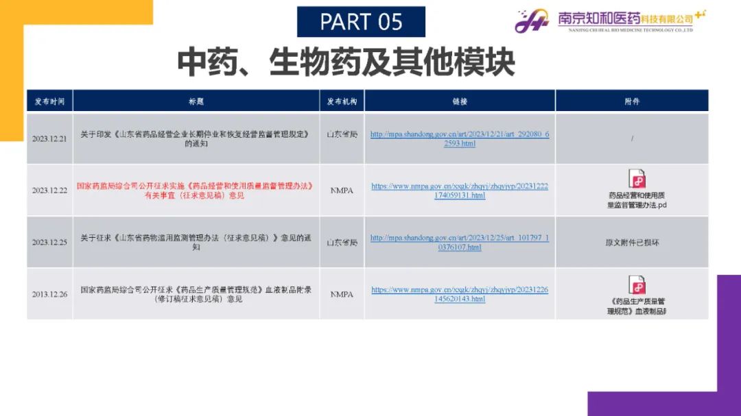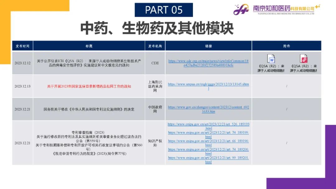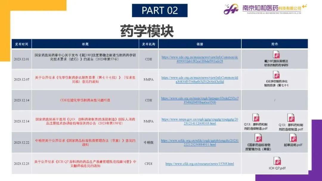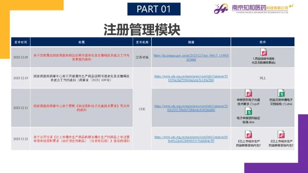 2024年1月(yuè)15日,知和(hé)醫藥注冊部帶來專題培訓《法規政策梳理(lǐ)與解讀(dú)》,從注冊管理(lǐ)模塊、藥學研究模塊、臨床與非臨床模塊、核查與變更模塊、中藥生物(wù)藥及其他(tā)模塊等五大(dà)模塊對CDE、NMPA、CFDI、藥監局(江蘇省、山東省)、藥審中心(江蘇省)、中檢院、藥物(wù)政策與基本藥物(wù)制(zhì)度司、中國政府網、知識産權局等權威單位2023年12月(yuè)發布的(de)29條法規政策及通知做深入梳理(lǐ)與解讀(dú),開(kāi)展專題培訓。