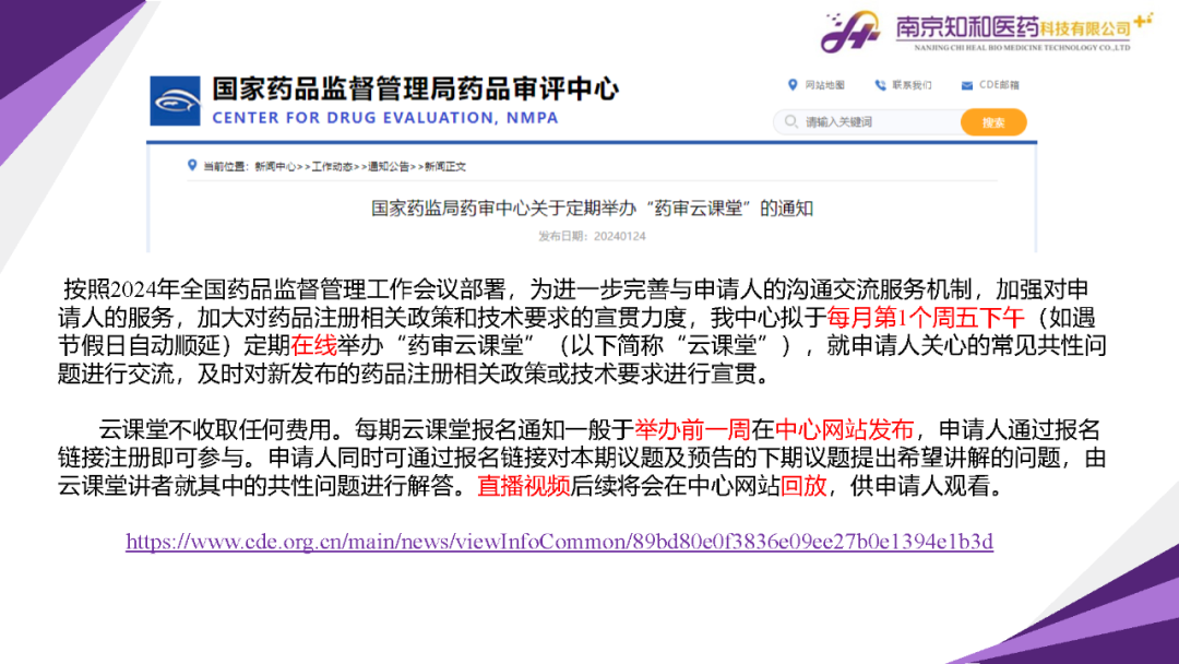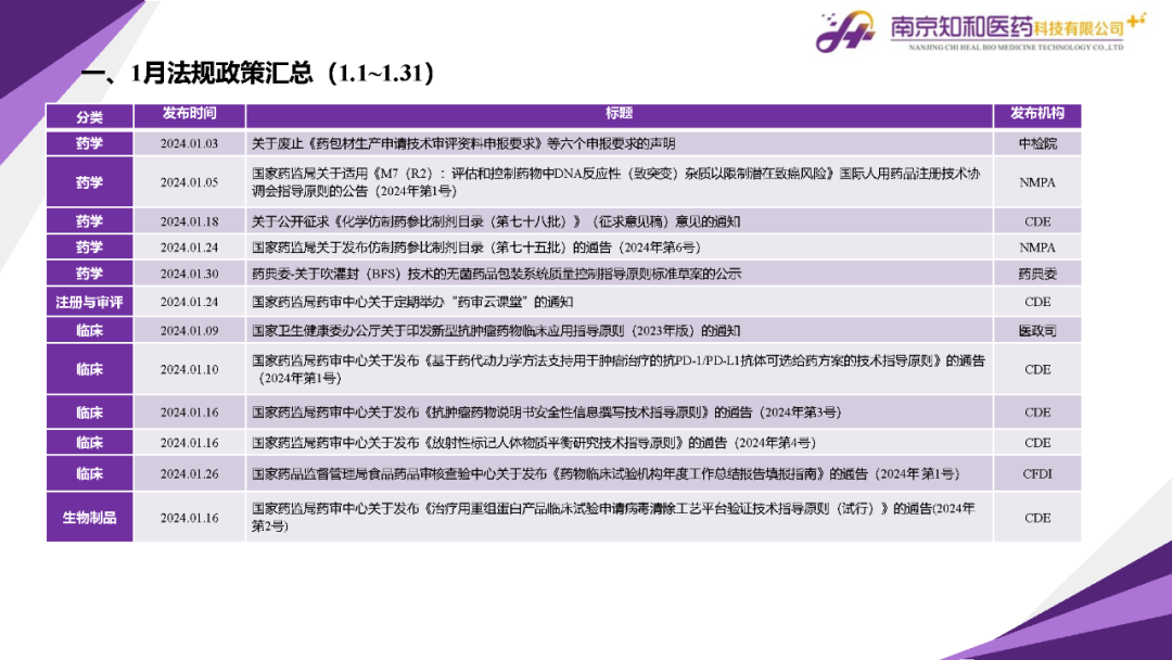 2024年2月(yuè)23日,知和(hé)醫藥注冊部帶來專題培訓《法規政策梳理(lǐ)與解讀(dú)》,從藥學研究模塊、注冊與審評模塊、臨床模塊、生物(wù)制(zhì)品與中藥模塊等四大(dà)模塊對CDE、NMPA、CFDI、中檢院、藥典委、醫政司等權威單位2024年1月(yuè)發布的(de)12條法規政策及通知做深入梳理(lǐ)與解讀(dú),開(kāi)展專題培訓。