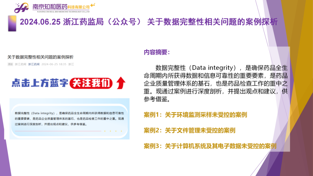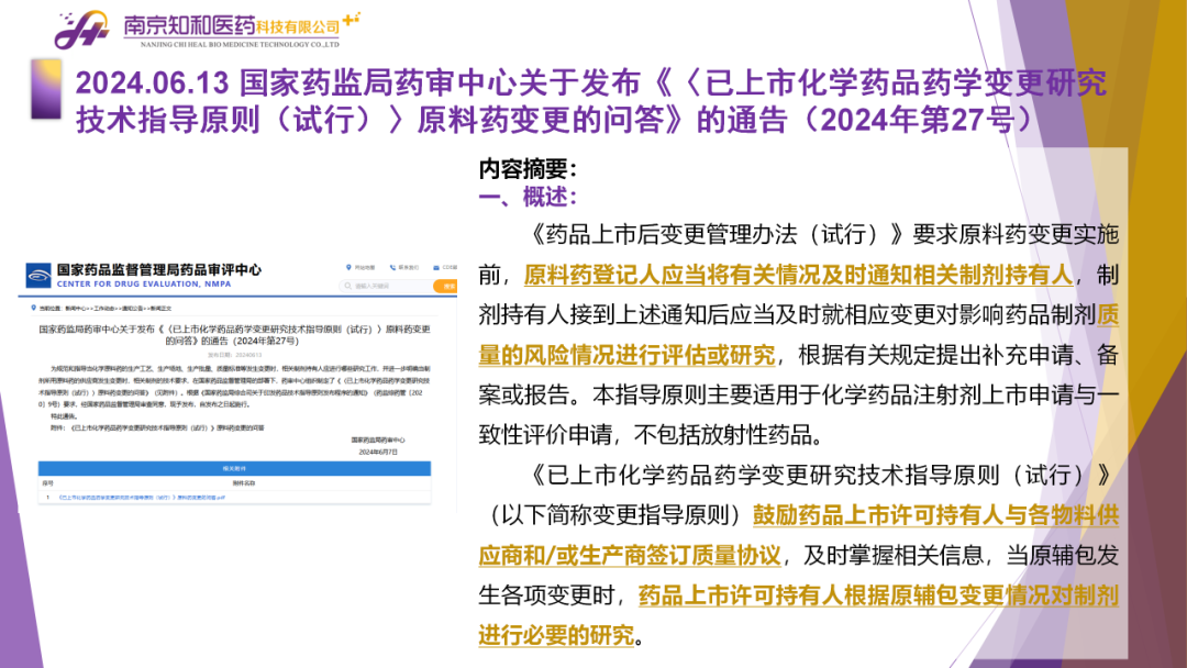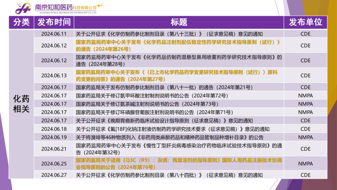2024年7月(yuè)9日,知和(hé)醫藥注冊部帶來專題培訓《法規政策梳理(lǐ)與解讀(dú)》,從大(dà)政方針、藥監程序、化藥相(xiàng)關、生産監管、臨床與非臨床、生物(wù)制(zhì)品相(xiàng)關、集采相(xiàng)關等模塊對國務院、CDE、浙江藥監局、NMPA、藥品大(dà)灣區審評中心、海(hǎi)南省藥品查驗中心、CDR等權威單位2024年6月(yuè)發布的(de)40條法規政策及通知做深入梳理(lǐ)與解讀(dú),開(kāi)展專題培訓。
