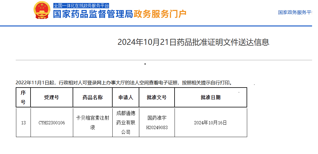 知和(hé)醫藥通過專業(yè)、高(gāo)效的(de)服務,助力合作夥伴 成都(dōu)通德藥業(yè)有(yǒu)限公司“ 卡貝縮宮素注射液” 仿制(zhì)藥上(shàng)市申請獲批。