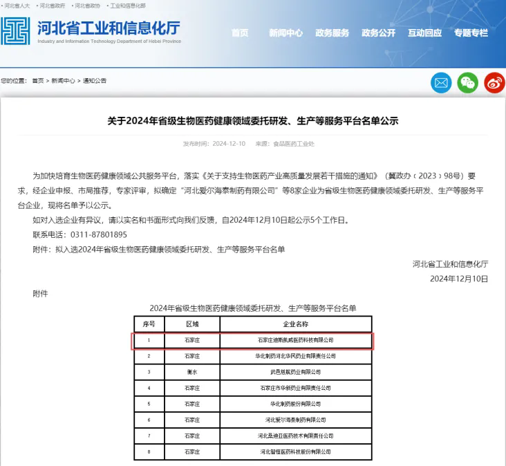 近日,河北省工(gōng)業(yè)和(hé)信息化廳公示了2024年省級生物(wù)醫藥健康領域委托研發、生産等服務平台名單,石家莊迪斯凱威醫藥科技有(yǒu)限公司成功入選,成爲入選該服務平台的(de)首批企業(yè)之一